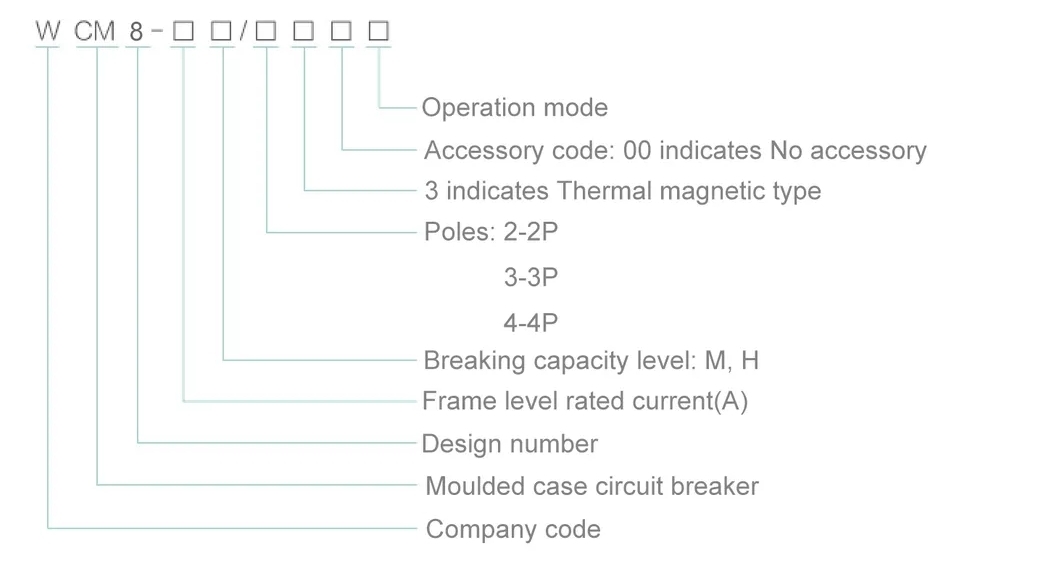 WCM8 series moulded case circuit breaker (MCCB for short) is one of updated type MCCBs researched and developed by the company by using advanced design and manufacture technology internationally. The rated insualted voltage is 800V (500V for WCM1-63). It applies for infrequent switch of the line of AC 50Hz, rated operation voltage 690V and below (400V for WCM1-63), and for infrequent starting of the motor. The MCCB with overload, short circuit and under-voltage protection fitting can protect the line and power device