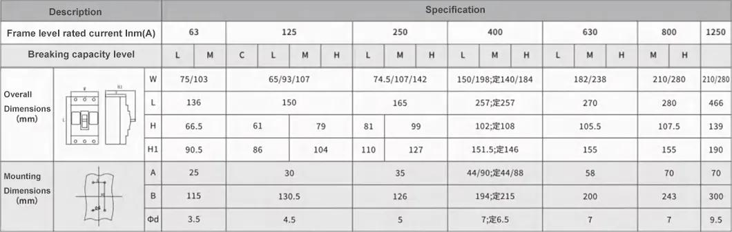 | Model | Frame level rated current (A) | Current Rating (A) | Rated operation voltage (V) | Rated insulation voltage (V) | Rated ultimate short circuit breaking capacity (kA) 400V | Rated operation short circuit breaking capacity (kA) 400V |