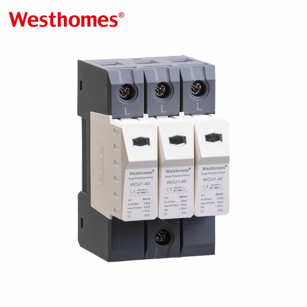Westhomes WCU1-40 3P AC DC SPD delivers 40kA surge protection for 275/385VAC systems! Features DIN rail mount, IP20 dust resistance, rust-proof terminals & seamless module replacement for household/industrial use.